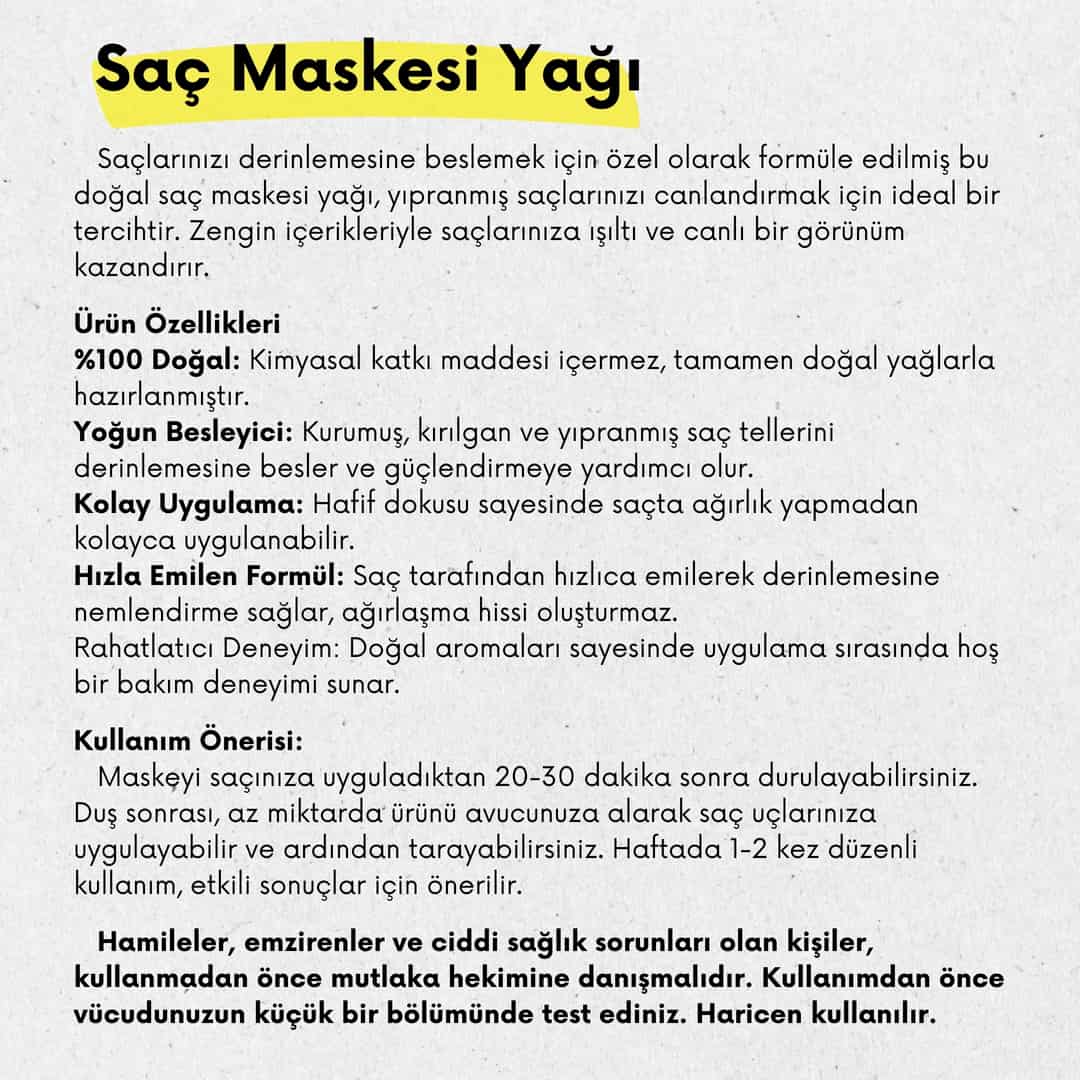 Saç Maskesi Yağı 50 ml Cam Şişede %100 Saf ve Doğal (Hair Mask Oil)